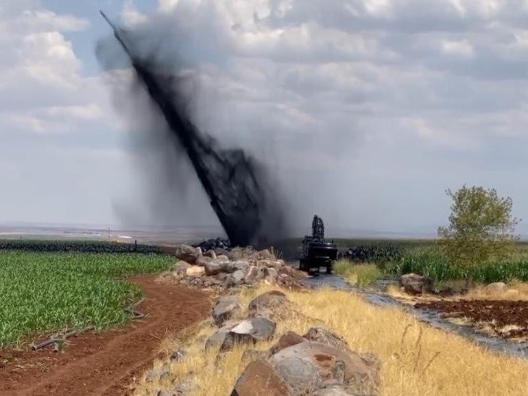 Şanlıurfa'nın Siverek ilçesinden geçen petrol boru hattı delindi. Yer altından metrelerce yüksekliğe petrol fışkırdı.