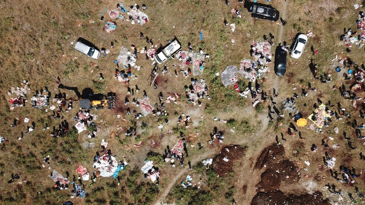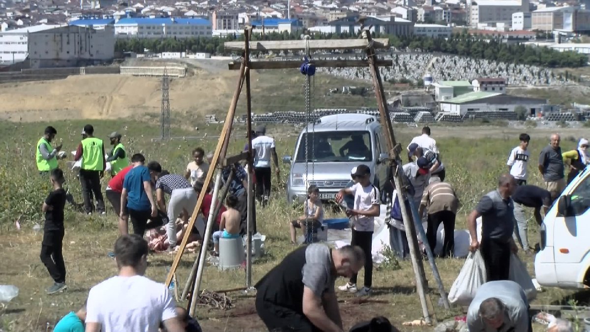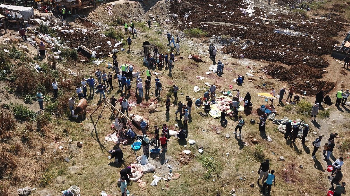 Esenyurt'taki kesim merkezinin hemen yanındaki boş arsada da onlarca kişi kesim yaparken, kesilen kurbanlıklar kepçelere asılarak deri yüzme işlemleri gerçekleştirildi.