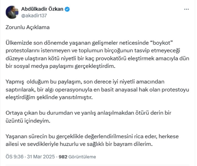 Özkan, 'boykot' çağrılarının artması ve tepkilerin ardından sosyal medya hesabından 'zorunlu açıklama' notuyla bir paylaşım yaptı: