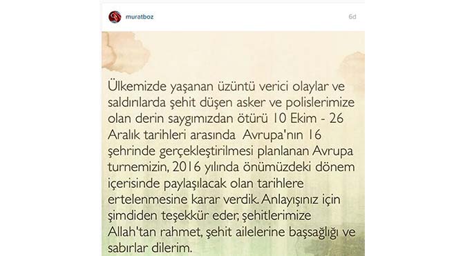 Murat Boz da Instagram hesabındaki paylaşımıyla Avrupa turnesini iptal ettiğini açıkladı.