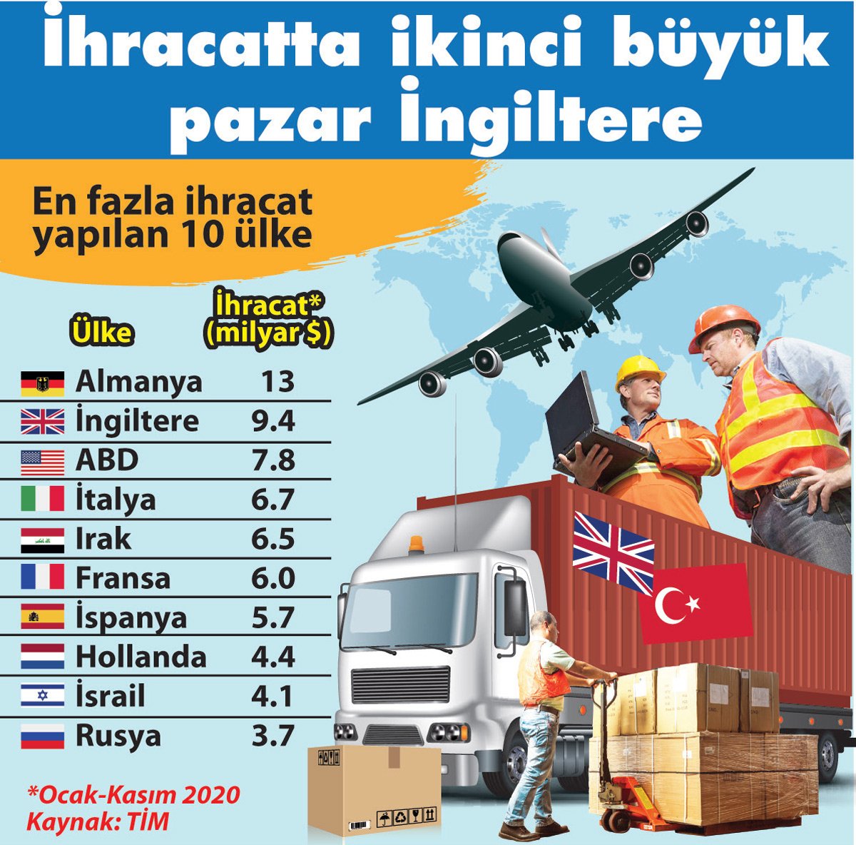 İngiltere, Almanya’nın ardından Türkiye’nin en büyük ikinci ihracat pazarı. Bu yılın ilk 11 ayında İngiltere’ye yaklaşık 10 milyar dolarlık ihracat gerçekleştirildi. İngiltere’ye en fazla hazır giyim ve konfeksiyon, otomotiv, kimyevi maddeler, gıda, hububat, elektrik ve elektronik sektörlerinde ihracat yapılıyor.