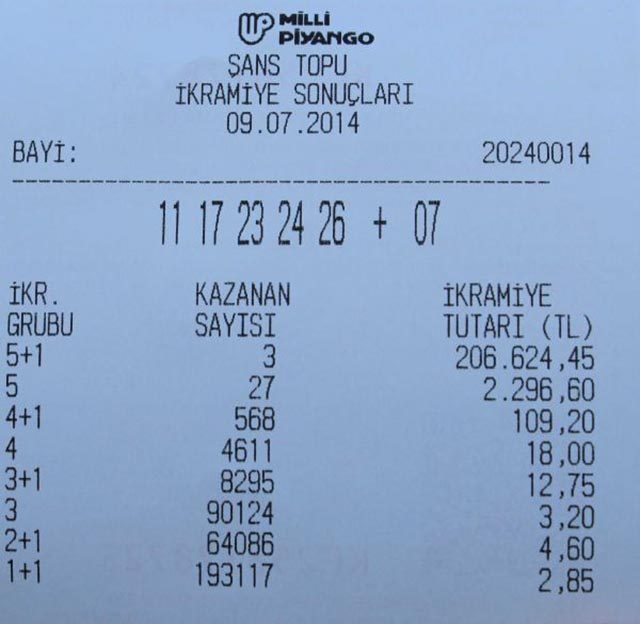 Şans Topu'nun bu haftaki çekilişinde 11, 17, 23, 24, 26 +7 rakamları çıktı. Denizlili Ali Yılmaz'ın Şans Topu'nu nasıl tutturduğunu açıklayan bayi Hasan Sabri Kaya, "Çekilişin yapılacağı gün talihli büfeye geldi. Brezilya- Almanya maçının gol dakikalarını yazdığını söyledi ve kuponu yatırdı. Aynı kuponda 5+1 ve 5 bildi. Kendisi yıllardır bana kupon yatırıyor. BAĞ-KUR emeklisi ve ekonomik sıkıntı içinde. Alacağı parayı güle güle harcasın" dedi.