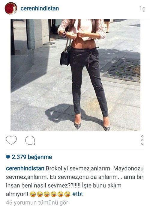 Eski fotoğrafların paylaşıldığı #tbt hashtagı altında hamilelik öncesi bir kareyi paylaşan Ceren Hindistan, fotoğrafının altına "Brokoliyi sevmez anlarım, maydanozu sevmez anlarım, eti sevmez onu da anlarım ama bir insan benim gibi birini nasıl sevmez? İşte bunu aklım almıyor!" notunu düştü. Ümit Aslan da "Kazanması yıllar süren, kırılması saniyeler alan ve dağıldıktan sonra tekrar toparlanması için ömür geçen şeye güven denir" karşılığını verdi.