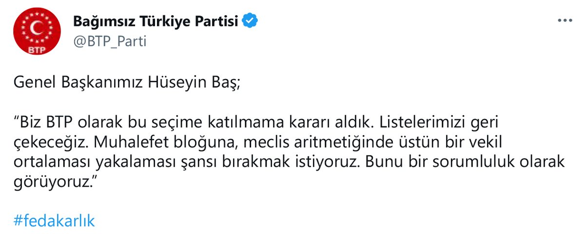 Karar, BTP'nin Twitter hesabından açıklandı. Partinin sosyal medya hesabından yapılan paylaşımda şöyle denildi: