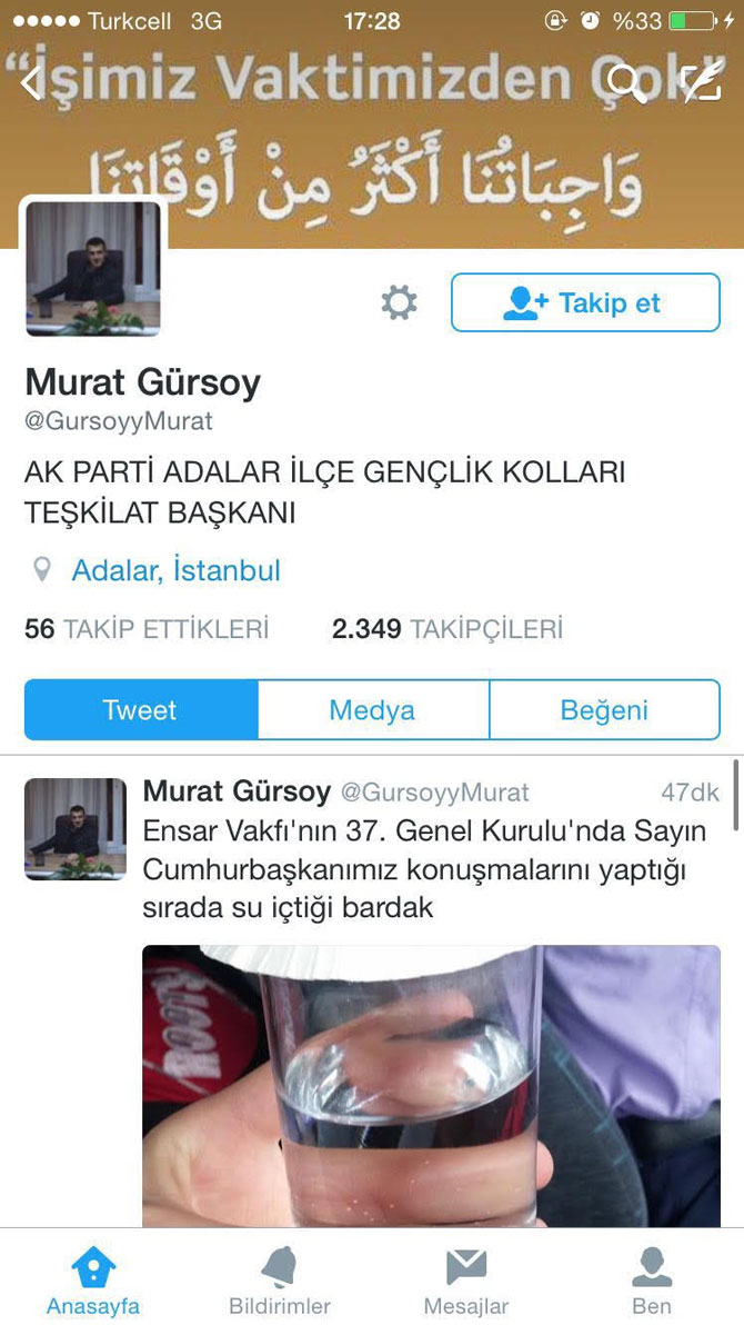 Erdoğan’ın konuşma yaptığı sırada kürsüde bulunan ve su içtiği bardak ise olay oldu. Cumhurbaşkanı’nın “Dudağının değdiği’’ bardağı saklayan, AKP Adalar Gençlik Teşkilatı Başkanı Murat Gürsoy, bardağın üzerine bir peçete örterek korumaya aldı. Başkan Gürsoy, bardağın fotoğrafını da twitter hesabından paylaştı ve “Ensar Vakfı'nın 37. Genel Kurulu'nda Sayın Cumhurbaşkanımız konuşmalarını yaptığı sırada su içtiği bardak” diye yazdı. Bu mesaj twitter’da, “Bardak-ı şerif’ yorumlarına neden oldu.