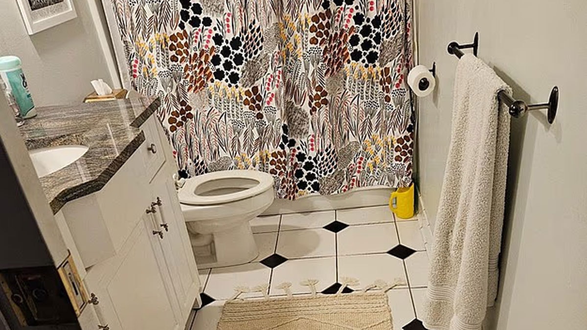 Fotoğrafa ilk bakıldığında sıradan bir banyo görülüyor. Desenli bir duş perdesi, beyaz dolaplar, bej renkli bir halı ve siyah-beyaz karolardan oluşan temiz bir zemin. Ancak bu sıradan manzaranın içinde öyle ustaca gizlenmiş bir cüzdan var ki sosyal medya kullanıcıları bu optik illüzyonu son zamanların en iyisi olarak tanımlıyor.