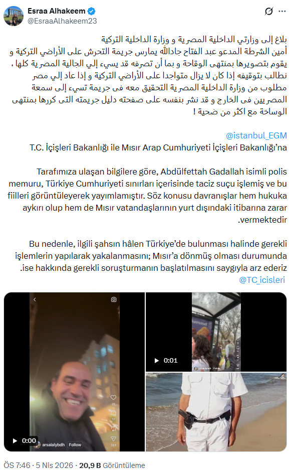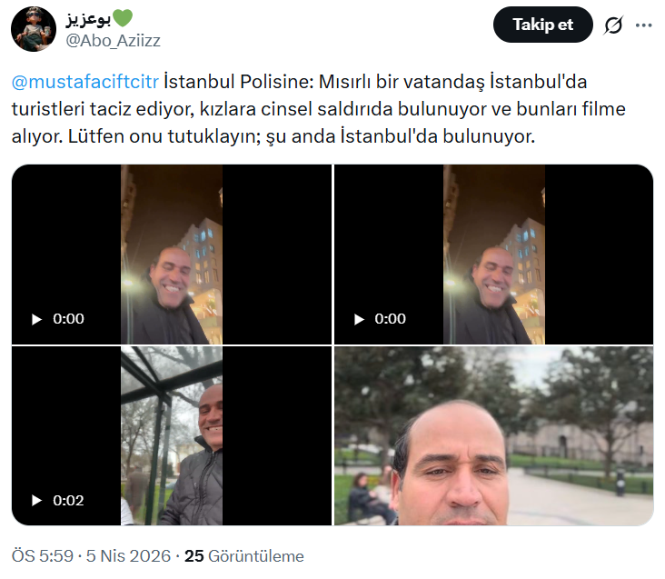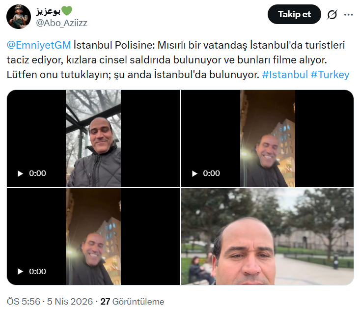 İstanbul'da yaşandığı belirtilen görüntülerde, kendisini "polis yardımcısı" olarak tanıtan Mısır vatandaşı bir kişinin kadınlara yönelik taciz iddiaları büyük yankı uyandırdı.