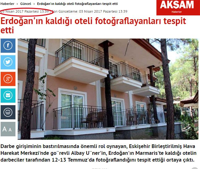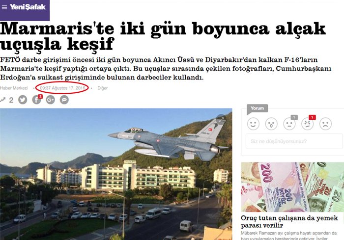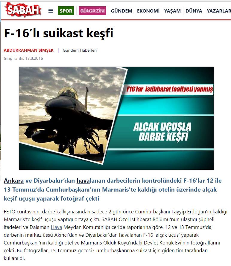 Şimşek imzalı 17 Ağustos 2016 tarihli yani darbe girişiminden sadece 2 ay sonra yapılan bir haberde "Ankara ve Diyarbakır’dan havalanan darbecilerin kontrolündeki F-16’lar 12 ile 13 Temmuz’da Cumhurbaşkanı’nın Marmaris’te kaldığı otelin üzerinde alçak keşif uçuşu yaparak fotoğraf çekti." ifadelerine yer veriliyor.