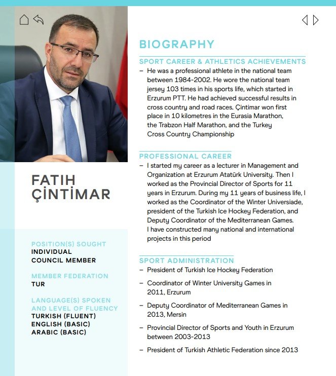 13 kişilik yönetime aday olan 27 isim arasında yer alan Çintimar, başvurusu ile ilgili İngilizce ve Fransızca tanıtım kitapçığında uzmanlık alanlarından ve özelliklerinden bazılarını şöyle sıraladı: Liderlik, stratejik düşünme, uluslararası ilişkiler, dürüstlük ve doğruluk!
