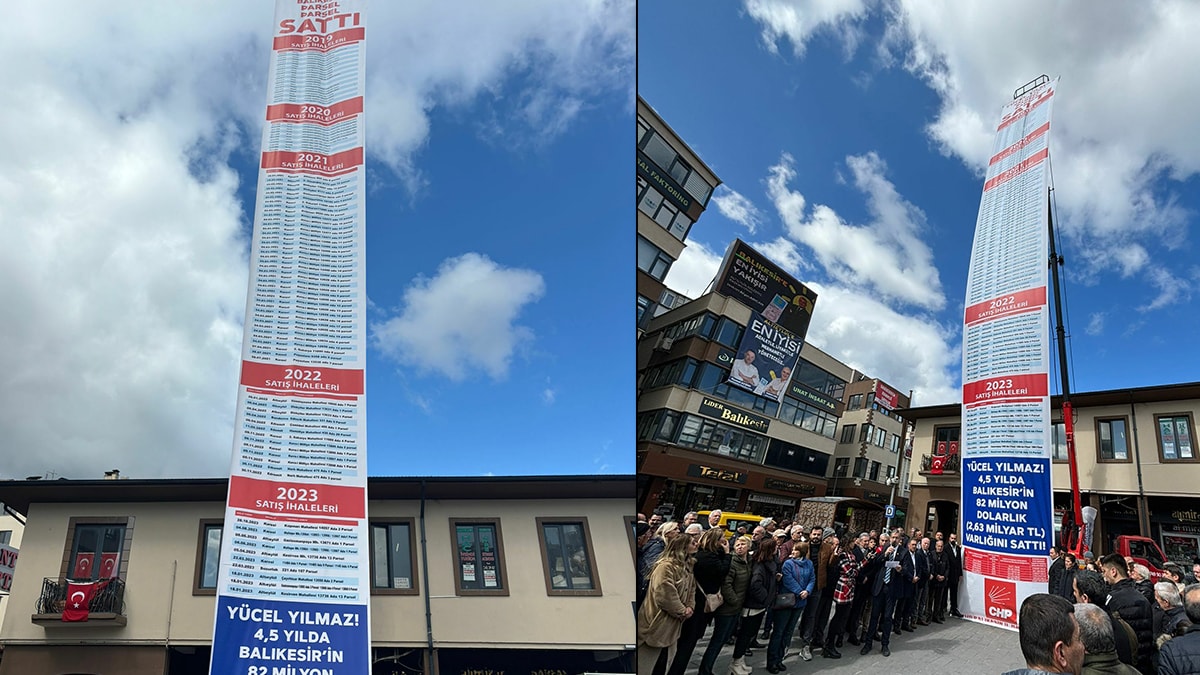 CHP Balıkesir İl Başkanlığı, AKP’li Büyükşehir Belediye Başkanı Yücel Yılmaz’ın yönetiminde 4.5 yılda satılan arazilerin listesinin yer aldığı pankartı Ali Hikmet Paşa Meydanı'na astı. 2