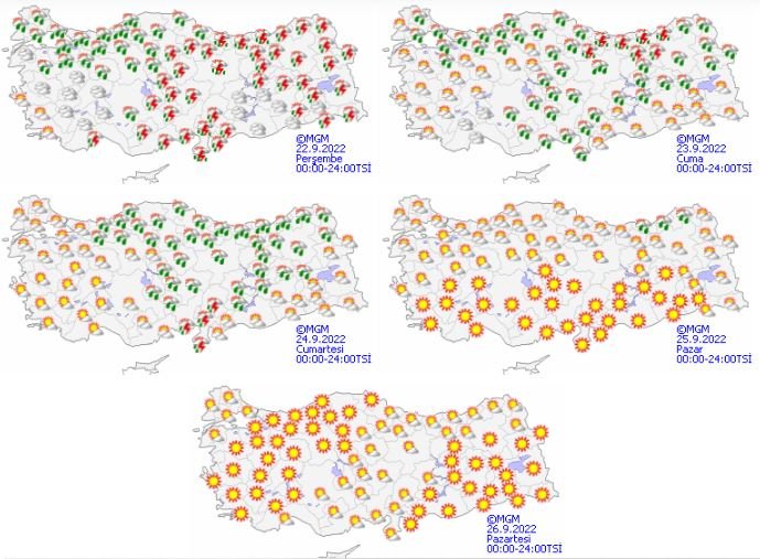 Meteoroloji Genel Müdürlüğü tarafından yapılan son değerlendirmelere göre: Ülkemiz genelinin parçalı ve çok bulutlu, Marmara'nın kuzey ve doğusu, Karadeniz, (Eskişehir hariç) İç Anadolu, Doğu Akdeniz, Doğu Anadolu ile Antalya, Gaziantep, Kilis, Batman ve Siirt çevrelerinin sağanak ve gök gürültülü sağanak yağışlı geçeceği tahmin ediliyor.