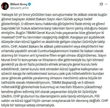 Açıklamasının sonunda ana muhalefet partisine seslenen Bülent Arınç, fiili saldırı ve kürsü işgalinin hiçbir zaman onaylanamayacağını belirterek, "CHP böyle bir tabloya sebep olmamalıydı" diyerek sözlerini noktaladı.