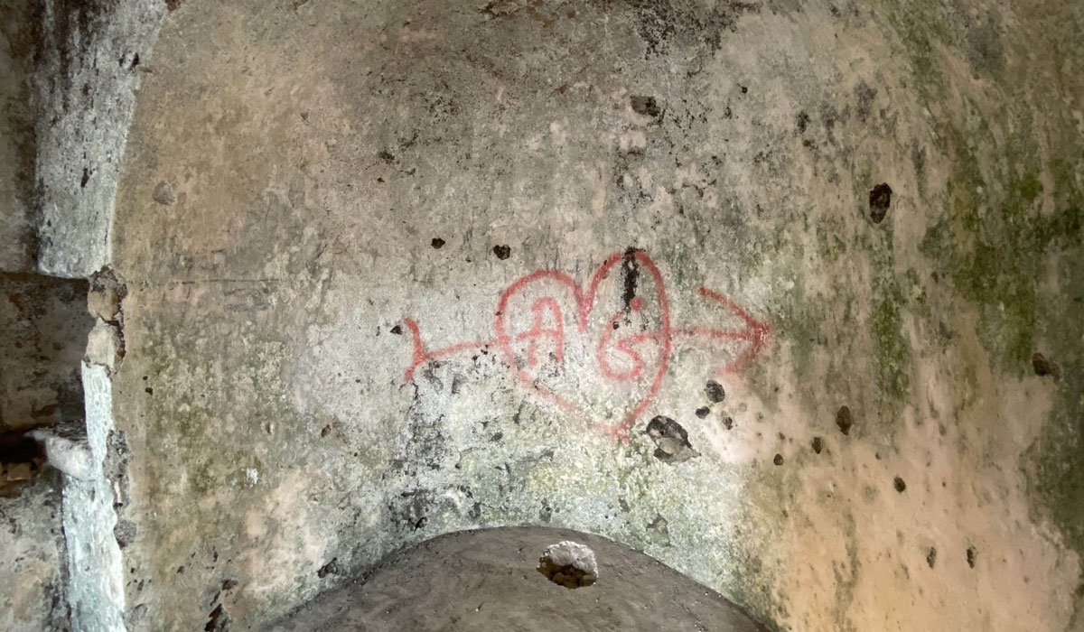 Tarihi evlerden birinin içindeki duvarlara kimliği belirsiz bir kişi tarafından sprey boya ile yazılar yazıldığı görüldü. (DHA)