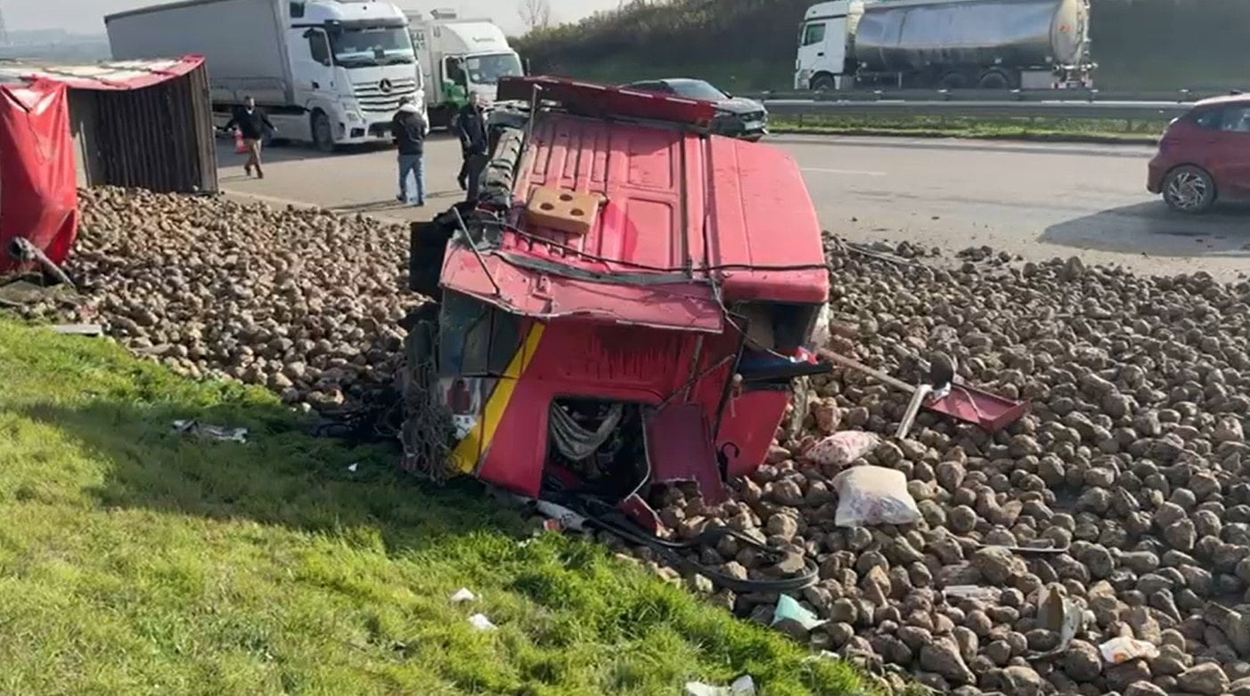 Bursa’da İstanbul-İzmir kara yolunda şeker pancarı yüklü TIR’ın hafif ticari araç ile kamyonete çarparak devrilmesi sonucu 1’i ağır 4 kişi yaralandı.