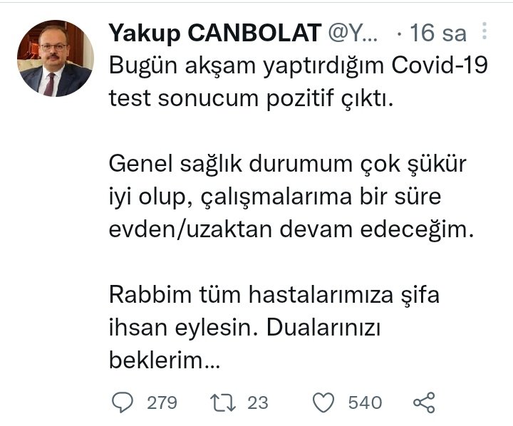 Bursa Valisi Yakup Canbolat, sosyal medyadan corona virüse yakalandığını duyurdu. Vali Canbolat, paylaşımında, "Bugün akşam yaptırdığım Covid-19 test sonucum pozitif çıktı. Genel sağlık durumum çok şükür iyi olup, çalışmalarıma bir süre evden/uzaktan devam edeceğim. Rabbim tüm hastalarımıza şifa ihsan eylesin. Dualarınızı beklerim" ifadelerini kullandı.