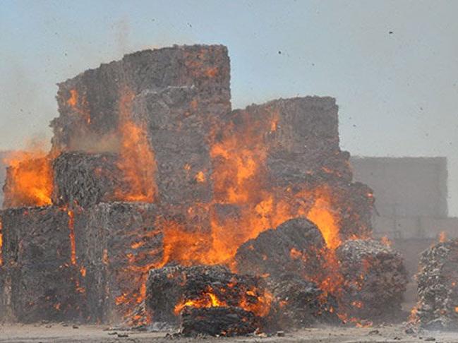 Bursa'nın Karacabey ilçesindeki karton fabrikasının bahçesinde karton balyaları, belirlenemeyen nedenle alev aldı. Çevredeki kuru otlara da sıçrayan yangının söndürülmesi için itfaiye ekipleri, çalışma başlattı.