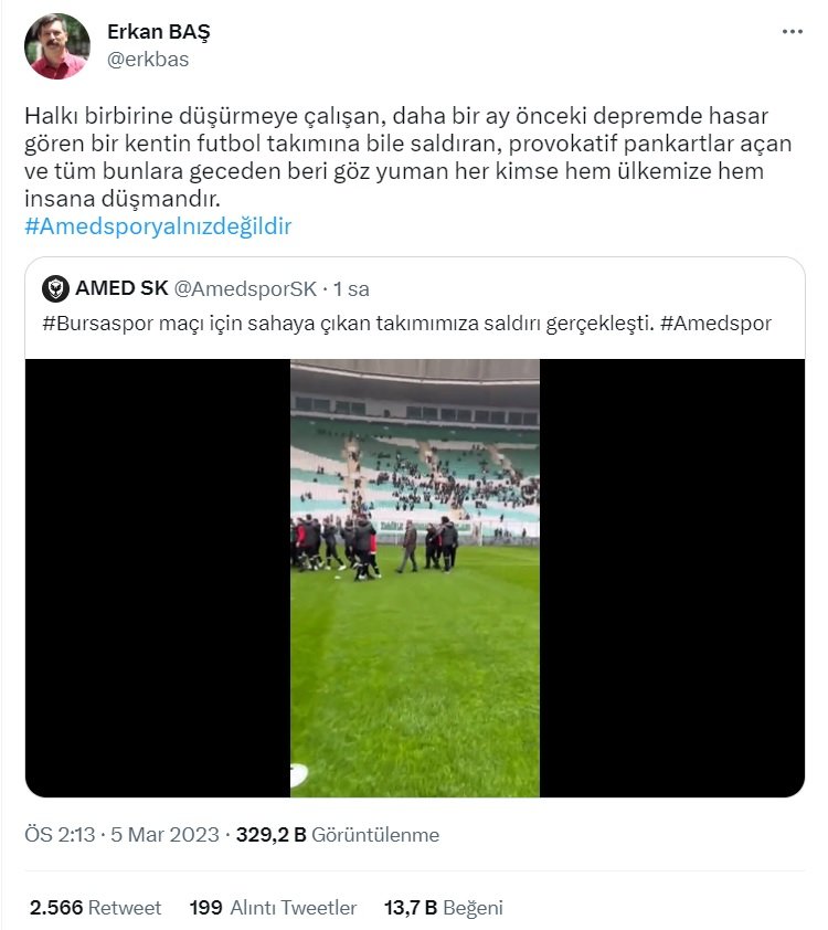 Bursaspor'un Amed Sportif Faaliyetleri 2-1 yendiği maçın sonunda çıkan olaylar nedeniyle Bursa Cumhuriyet Başsavcılığı'nda soruşturma başlatıldı. Bursa Cumhuriyet Başsavcılığı'ndan yapılan açıklamada, "TFF 2. Lig Bursaspor-Amed Sportif futbol takımları arasındaki müsabaka sonrası soyunma odası koridorunda meydana geldiği iddia edilen darp ile ilgili Cumhuriyet Başsavcılığımız tarafından derhal soruşturma başlatılmıştır. İddialar tüm yönleriyle soruşturulmaktadır. Kamuoyuna saygıyla duyurulur" ifadeleri kullanıldı.SOYLU'DAN O PANKARTLAR İLE İLGİLİ AÇIKLAMA