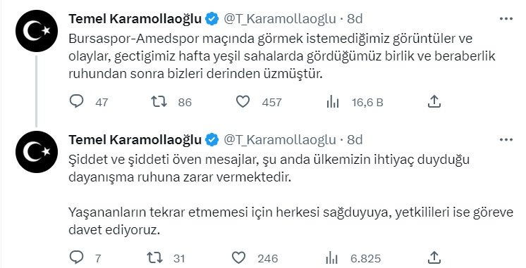 Saadet Partisi lideri Temel Karamollaoğlu, “Bursaspor-Amedspor maçında görmek istemediğimiz görüntüler ve olaylar, geçtiğimiz hafta yeşil sahalarda gördüğümüz birlik ve beraberlik ruhundan sonra bizleri derinden üzmüştür. Şiddet ve şiddeti öven mesajlar, şu anda ülkemizin ihtiyaç duyduğu dayanışma ruhuna zarar vermektedir. Yaşananların tekrar etmemesi için herkesi sağduyuya, yetkilileri ise göreve davet ediyoruz.” paylaşımında bulundu.