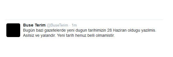 Terim bu defa da geride bıraktığımız günlerde yapılan yeni düğün tarihi haberlerini yalanladı. Buse Terim twitter hesabından attığı tweette şunları yazmış...