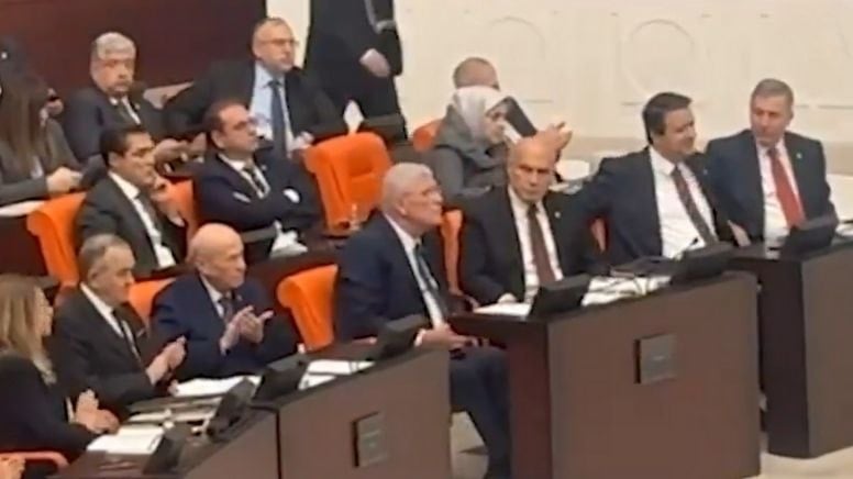 Bakırhan'ın konuşması DEM Parti sıraları ile Bahçeli ve MHP sıraları tarafından da alkışlandı.
