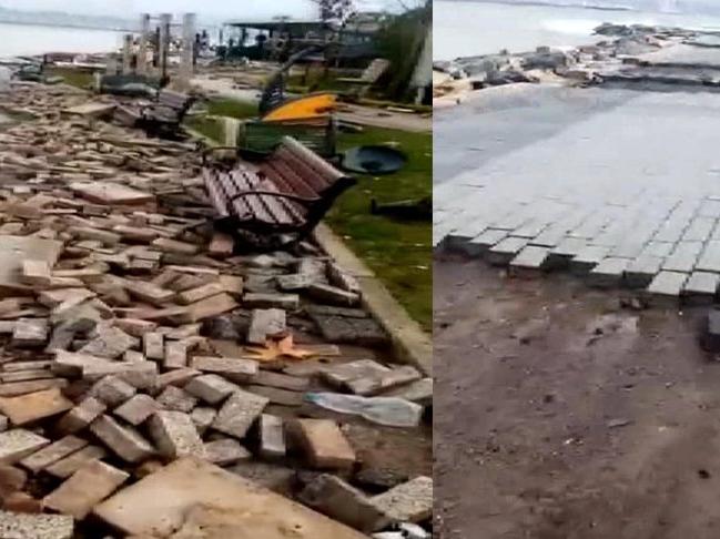 Sahil yolu ve çocuk parkındaki parke taşları da yerinden sökülerek etrafa saçıldı.