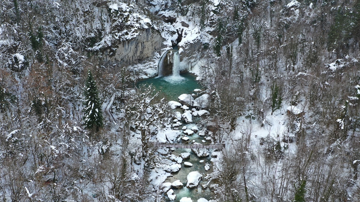 Şelalenin etrafındaki ağaçlar karla farklı bir güzellik sergiliyor.