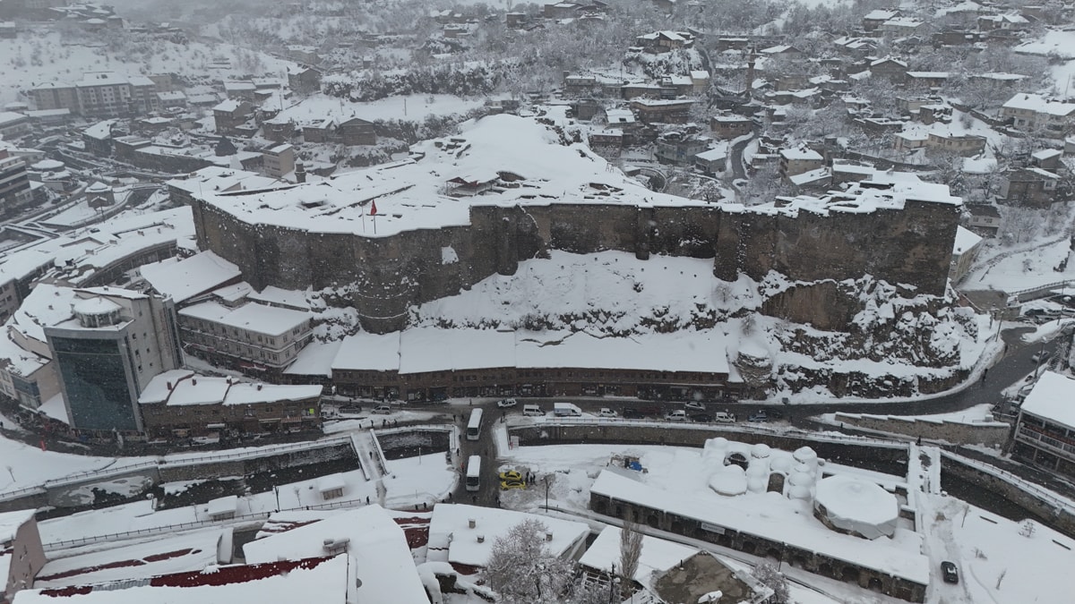 Bitlis'in tarihi dokusu, yağan kar örtüsüyle birleşince güzel görüntüler ortaya çıktı. Türkiye'nin en çok kar alan kentlerinden olan ve artık tarihi dokusuyla da dikkat çeken Bitlis'in karlı hali, havadan görüntülendi.