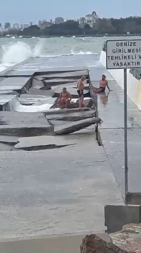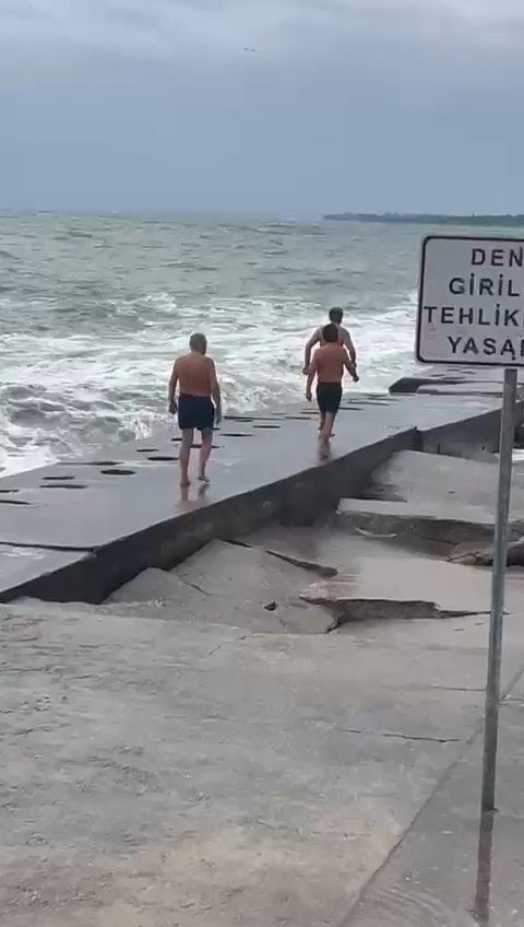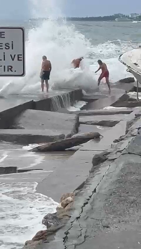 Şiddetli lodos nedeniyle sahildeki dalgaların yer yer kayalıkların üzerine kadar yükseldiği sırada, denize girmekte ısrar eden 3 kişi bir anda kontrolünü kaybederek dev dalgaların etkisiyle kayalıklara düştü. Çevredekilerin ihbarı üzerine olay yerine sağlık ekipleri sevk edildi.