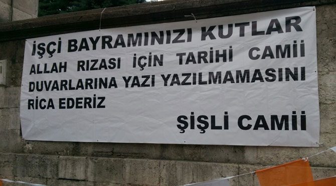 Bu arada Şişli Camisi'nin duvarına asılan ve üzerinde "İşçi bayramınızı kutlar, Allah rızası için tarihi caminin duvarlarına yazı yazılmamasını rica ediyoruz" uyarısı bulunan pankart da dikkati çekti. Ayrıca, DİSK temsilcileri, genel merkez önüne gelen bir grubu bölgeden ayrılmaları yönünde uyararak, "provokasyona yol açacak" grupları aralarında istemediklerini söyledi.