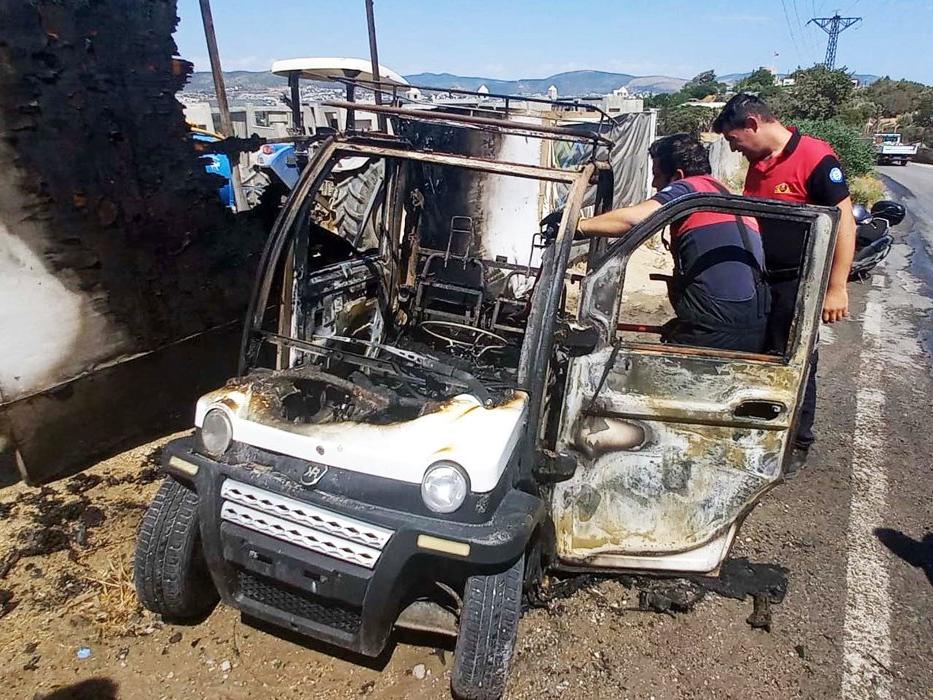 Muğla’nın Bodrum ilçesine bağlı Bitez Mahallesi’nde ki Selvi Caddesi’nde bugün öğle saatlerinde meydana gelen olayda Seyit Çalışkan’ın kullandığı elektrikli iki kişilik otomobil alev aldı.