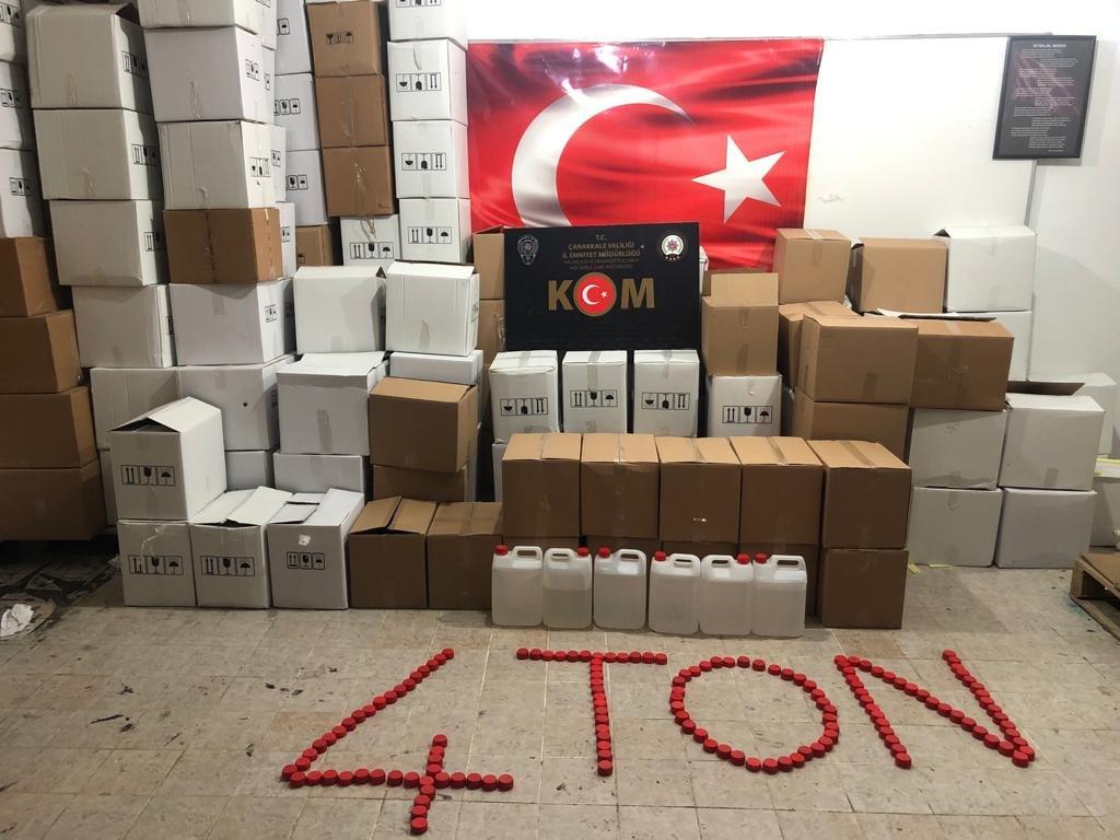 Çanakkale'de, polis ekiplerince depoya düzenlenen baskında 4 ton sahte etil alkol ele geçirildi.