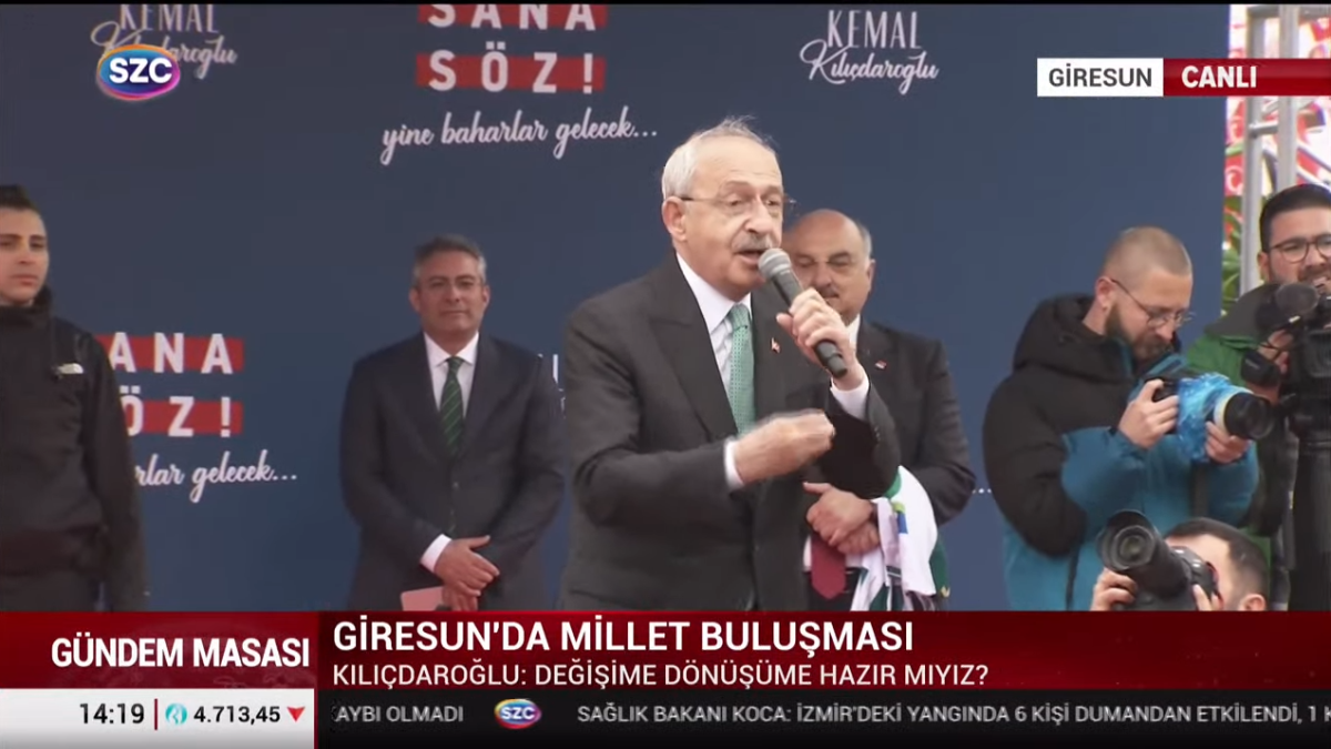 14 Mayıs seçimlerine 16 gün kala partilerin ve ittifakların seçim çalışmaları sürüyor. Millet İttifakı’nın cumhurbaşkanı adayı CHP lideri Kemal Kılıçdaroğlu, bugün Giresun'da vatandaşların karşısına çıktı.