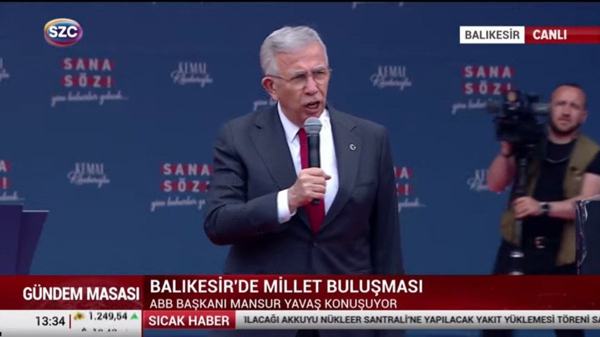 Ankara Büyükşehir Belediye Başkanı Mansur Yavaş, Balıkesir'de düzenlenen Millet Buluşması'nda konuştu. Yavaş, "Kılıçdaroğlu seçilirse İHA'larımızı, SİHA'larımızı, F-16'larımızı hangara kapatırlar" diyen Tarım Bakanı Vahit Kirişçi'ye yanıt verdi.