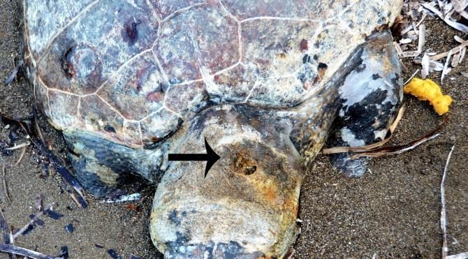 BODRUM sahilinde başından 3 kurşunla vurularak öldürülmüş caretta caretta türü deniz kaplumbağası bulundu.