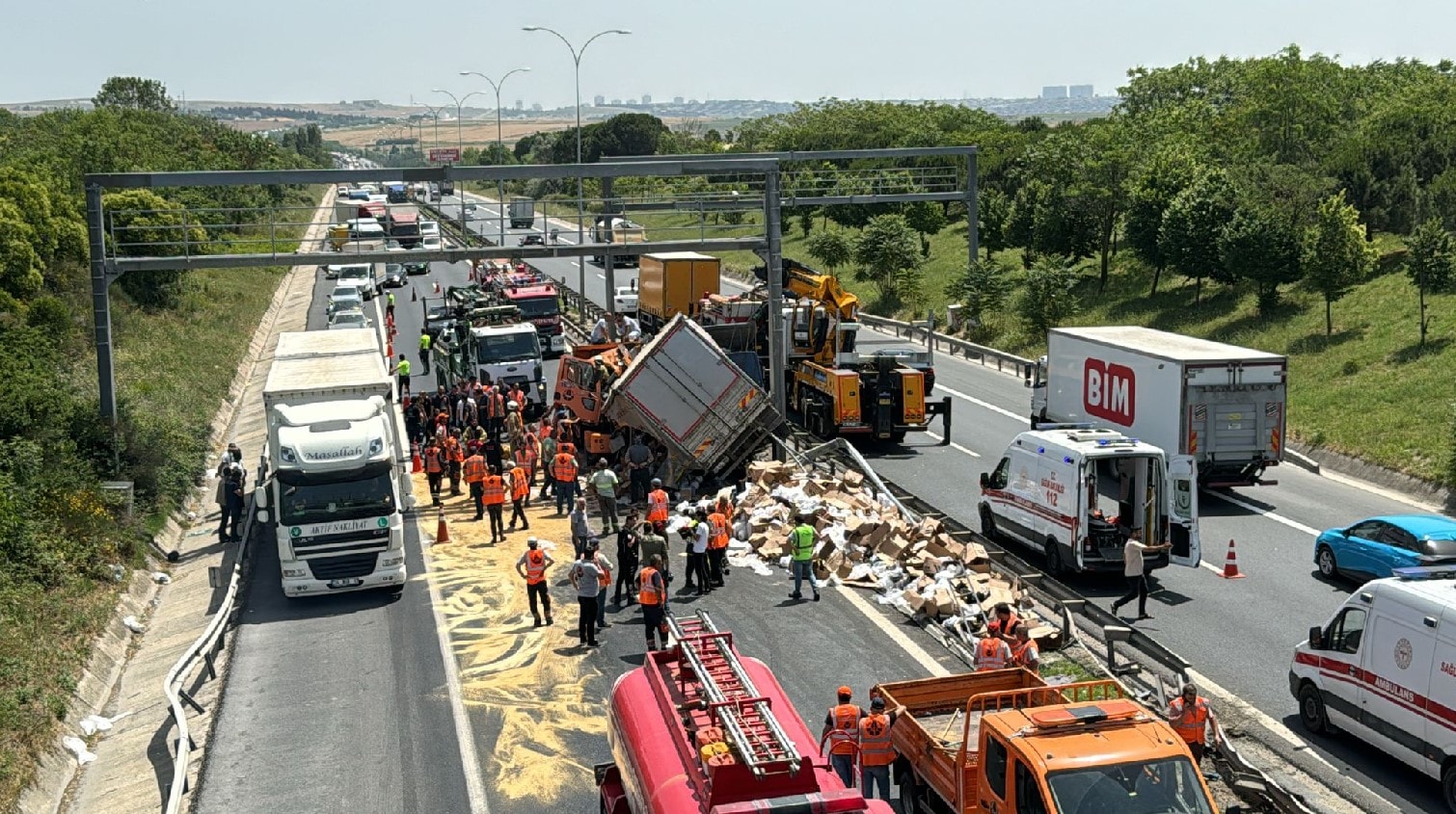 Yaralılar ambulansla hastaneye götürüldü. Kazada kamyondaki malzemeler yola saçıldı, TEM Otoyolu'nda iki şeritte de yoğun trafik oluştu.