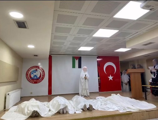 Küçükköy Kız Anadolu İmam Hatip Lisesi’nde Filistin’e destek temasıyla düzenlenen etkinliğe onlarca öğrenci katılırken yapılan tiyatro gösterisinde 5 öğrenci yere yatırılarak üzerleri beyaz kefenle örtüldü. Küçük kız çocuklarının başlarının kapatıldığı törende erkek öğrencilerden bazılarına da asker kıyafeti giydirildi.