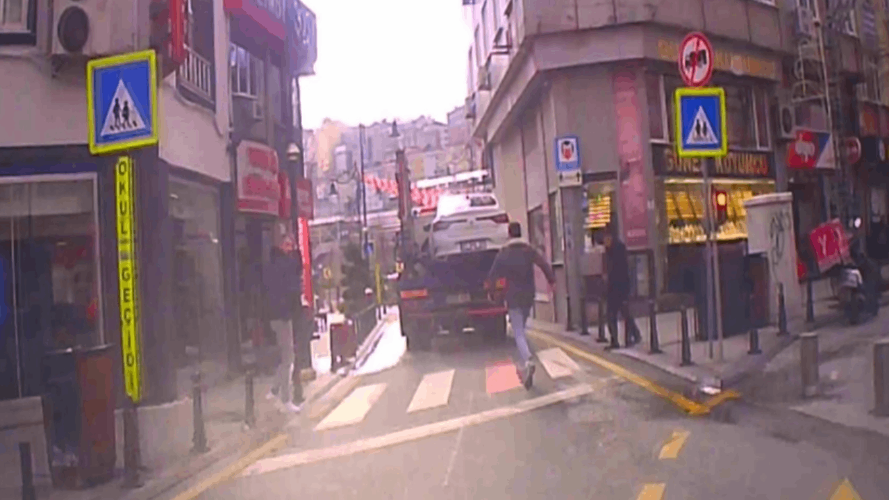 Kağıthane'de aracını yasak olan yere park ederek bankaya giden sürücü, trafik çekicisinin aracını götürdüğünü görünce metrelerce peşinden koştu. Yolda bir araca binerek çekiciyi yakalamayı başaran sürücü, aracını kurtarırken o anlar hem araç kamerasına hem de cep telefonu kamerasına yansıdı.