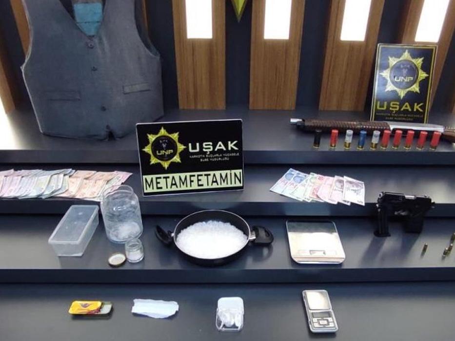Uşak merkez ilçede yapılan operasyonlarda 5 şahıstan toplam 365 gram metamfetamin, 1 adet ruhsatsız tabanca, 11 adet tabanca fişeği, 1 adet ruhsatsız tüfek, 2 adet hassas terazi, 1 adet çelik yelek ve çeşitli suçlardan elde edildiği değerlendirilen 7130 TL para ele geçirildi.