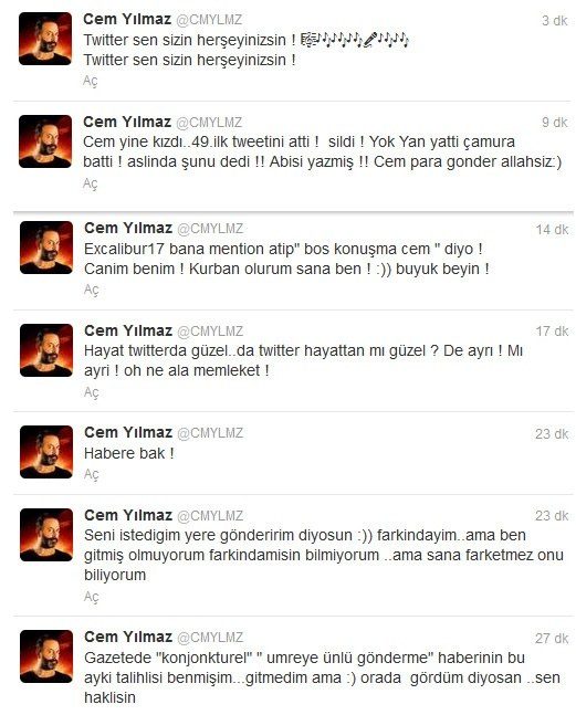 Yılmaz, hesabından 'Gazetede 'Konjonktür el' Umre ‘ye ünlü gönderme haberlerinin bu ayki talihlisi benmişim. Gitmedim ama orada gördüm diyorsan sen haklısın. Seni istediğim yere gönderirim diyorsun farkındayım ama ben gitmiş olmuyorum farkında mısın bilmiyorum ama sana fark etmez onu biliyorum. Hayat twitter'da güzel da hayat twitter hayattan mı güzel? De ayrı mı ayrı oh ne ala memleket' notunu düştü.Twitter'da 4 milyona yakın takipçisi olan Cem Yılmaz, bugüne kadar 9 tweet attı.