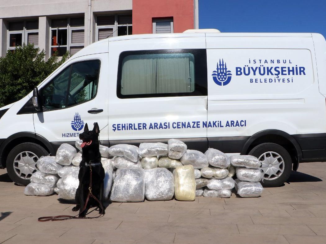 Ekipler, aracın cenaze taşıma bölümünde, narkotik köpek 'Oscar' ile arama yaptı. 'Oscar'ın tepki vermesi üzerine araçtaki detaylı incelemede, 24 kilosu esrar tozu olmak üzere 144 kilo 550 gram esrar ele geçirildi.