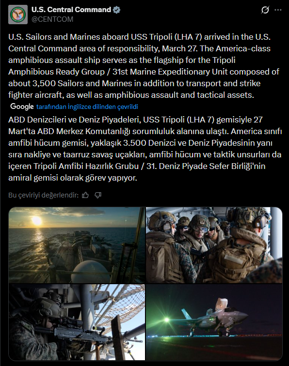 ABD Merkez Komutanlığı (CENTCOM), sosyal medya hesabından yaptığı açıklama ile yaklaşık 3 bin 500 denizci ve deniz piyadesini taşıyan USS Tripoli amfibi hücum gemisinin Orta Doğu’daki görev bölgesine ulaştığını duyurdu.