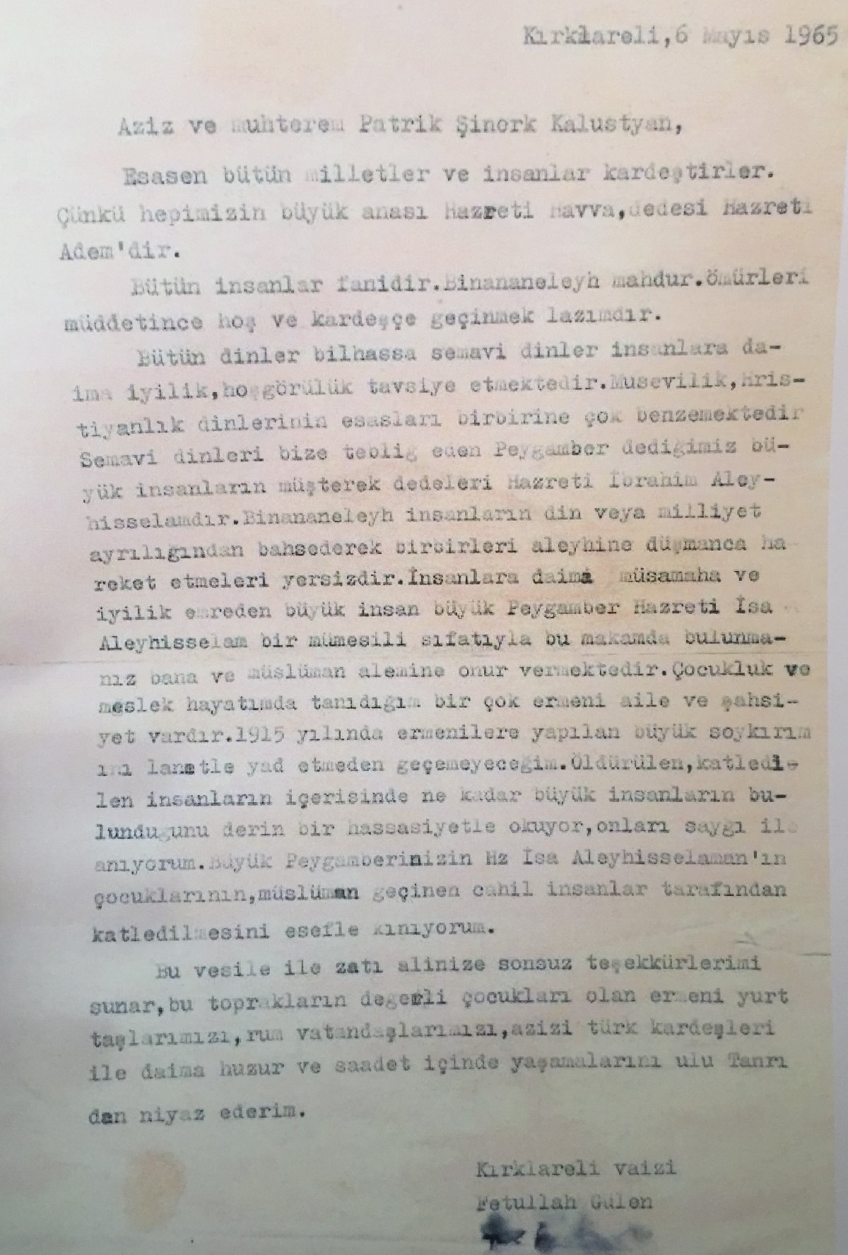 Şüphelilerden N.G'nin evinde ele geçirilen dijital materyaller arasında, örgüt elebaşı Fetullah Gülen'in 1965 yılında Kırıklareli'nde bir camide vaiz olarak görev yaparken, Ermeni Patrik Şinork Kalustyan'a yazdığı mektup ortaya çıktı. Gülen'in kaleme aldığı mektupta, sözde Ermeni soykırımını tanıyarak şunları yazdığı görüldü: