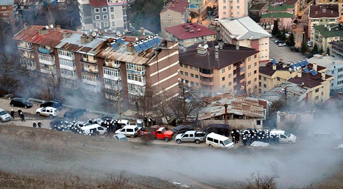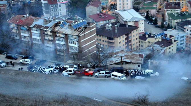 Polis ekipleri, saat 17.00 sıralarında kalabalığa yolu açmaları ve dağılmaları yönünde uyarı yapmaya başladı. Grup dağılmayınca çevik kuvvet iki ayrı noktadan biber gazıyla müdahale etti. Bu sırada plastik mermiyle havaya uyarı ateşi de açıldı. Yaklaşık 15 dakika süren yoğun biber gazlı müdahalenin ardından gruptakiler tepelere doğru kaçtı. Gazdan etkilenen çok sayıda kişiye sağlık ekipleri ambulanslarda müdahale etti. Bu arada çevredeki evlerde oturanlar da polisin biber gazına maruz kaldı.