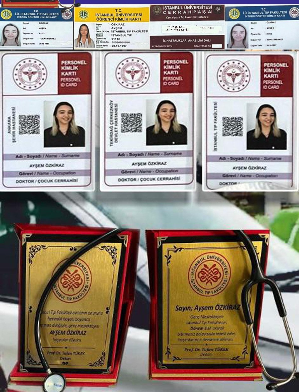 Sahte doktor rolüne bürünen Ayşe Özkiraz'ın evinde yapılan aramalarda ameliyathanede çektirdiği fotoğraflar, adına düzenlenen sahte Ankara Şehir Hastanesi personel kimlik kartı, Çerkezköy Devlet Hastanesi personel kimlik kartı ve İstanbul Üniversitesi Tıp Fakültesi öğrenci kimlik kartı, İstanbul Üniversitesi İstanbul Tıp Fakültesi intörn doktor kimlik kartı, İstanbul Tıp Fakültesi'ni birincilikle bitirdiği belirtilen bir plaket de bulundu. (DHA)