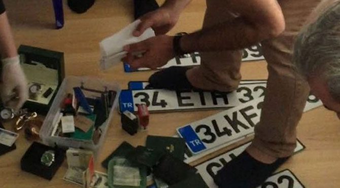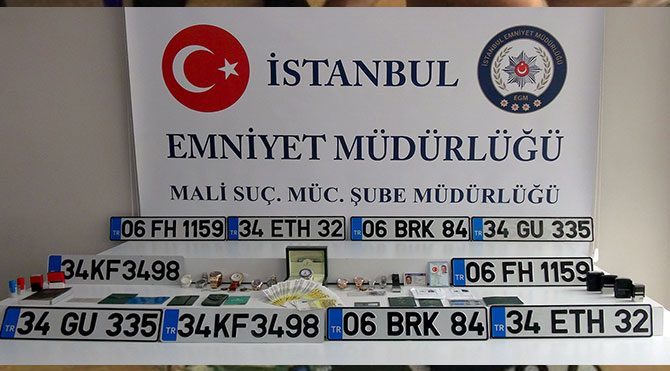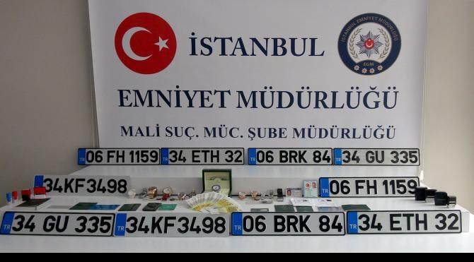 Evde yapılan aramada 5 çift sahte otomobil plakası, 12 lüks markalı saat, farklı isimlerde düzenlenmiş sahte kimlikler ve ehliyet, sahte 300 dolar, sahte 6 bin Euro ve 6 döviz bürosuna ait kaşe ele geçirildi.