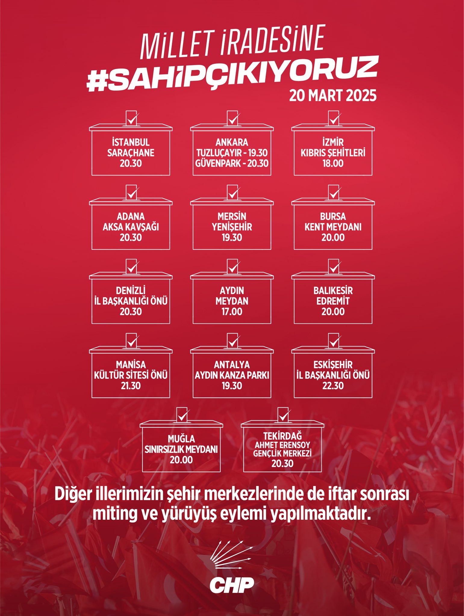 İBB ve TBB Başkanı Ekrem İmamoğlu'nun gözaltına alınmasının ardından CHP, 14 büyükşehir belediyesinde ve 21 ilde miting çağrısı yaptı. Yarın akşam 20.30'da gerçekleştirilecek miting için il başkanlarına yazı gönderildi. Gönderilen yazıda "21 Mart Cuma günü akşam saat 20.30'da 14 büyükşehir belediyemizde 21 il belediyemizde ve büyükşehir veya il belediyesinin partimizde olmadığı kentlerde imkanları ölçüsünde büyük merkez ilçelerde, il ve ilçelerimizdeki uygun miting alanlarında belediye başkanlarımız ve örgütümüzün birlikte miting yapması kararlaştırılmıştır. Her ilde mitingler tek bir noktada yapılacaktır" denildi.
