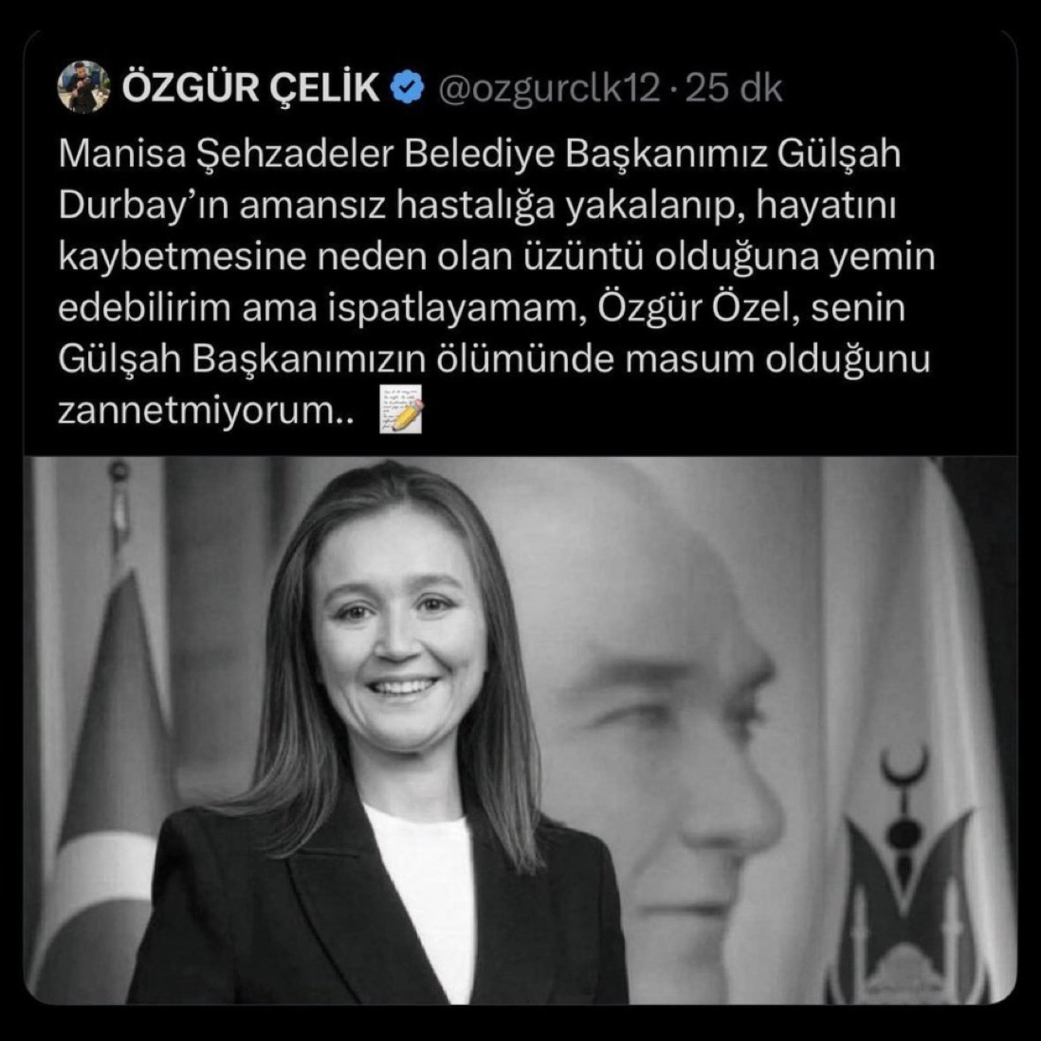 Çelik Türkçe hataları ile dolu paylaşımında sosyal medyadan yaptığı paylaşımda, "Manisa Şehzadeler Belediye Başkanımız Gülşah Durbay'ın amansız hastalığa yakalanıp, hayatını kaybetmesine neden olan üzüntü olduğuna yemin edebilirim ama ispatlayamam, Özgür Özel, senin Gülşah Başkanımızın ölümünde masum olduğunu zannetmiyorum" ifadelerini kullandı.
