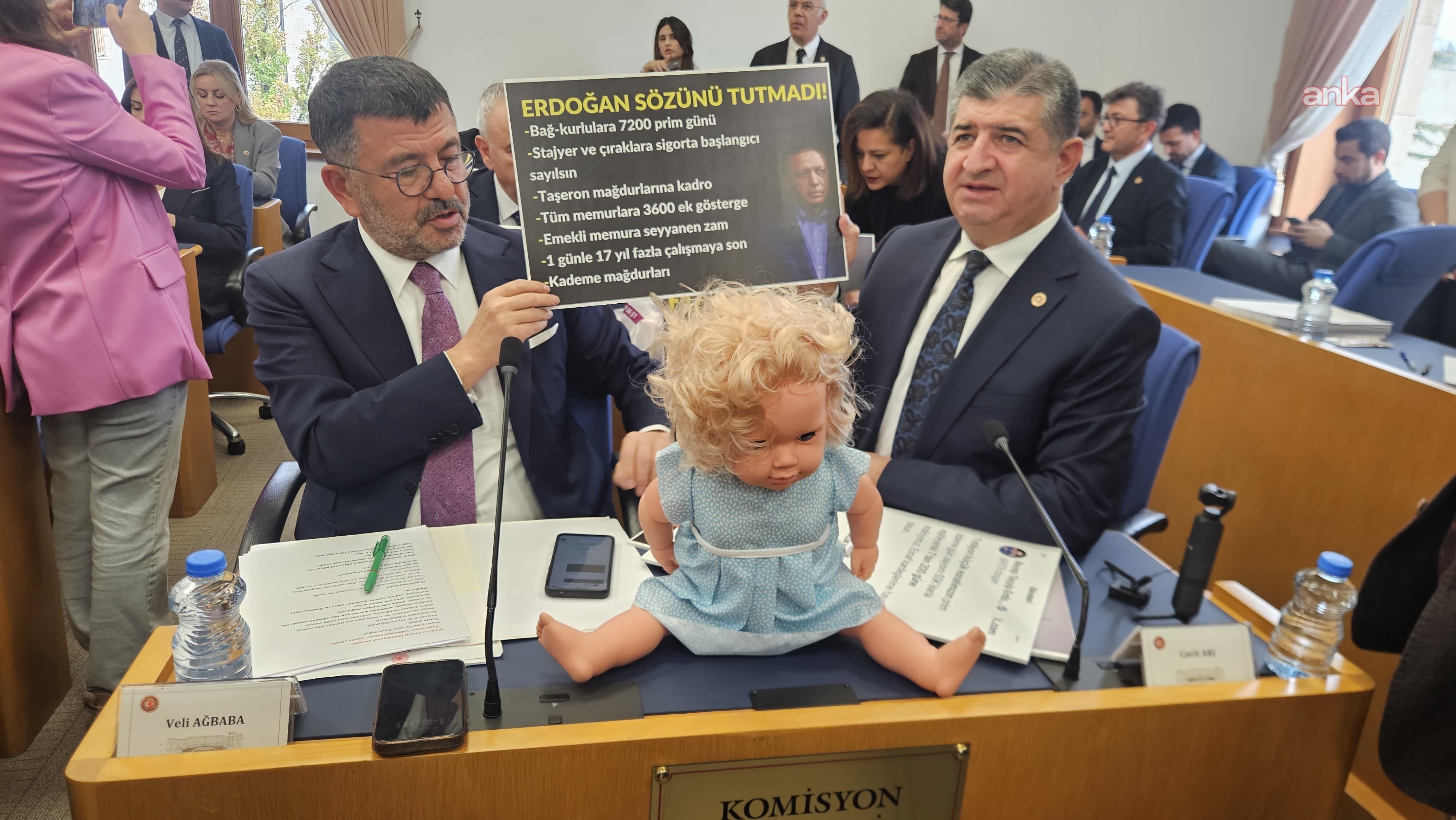 CHP milletvekilleri, konuşma sırasında ellerinde taşıdıkları oyuncak bebeği göstererek, “Bu bebek borçla doğuyor” sloganları attı. Protesto sırasında kısa süreli gerginlik yaşandı, ardından komisyon toplantısı devam etti.