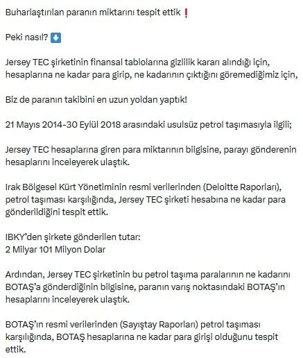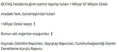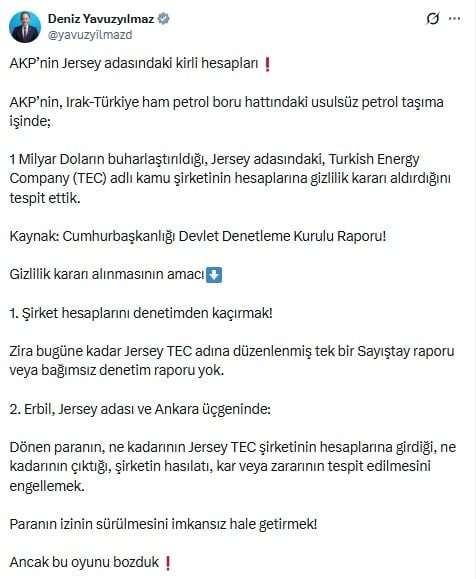 CHP'nin Kamu Yönetimi ve Yolsuzluklarla Mücadele Birimi Başkanı Deniz Yavuzyılmaz sosyal medya hesabından yaptığı paylaşımda AKP'nin Irak-Türkiye ham petrol boru hattındaki usulsüz petrol taşıma işinde bir kamu şirketi hesaplarına gizlilik kararı aldırdığını açıkladı.