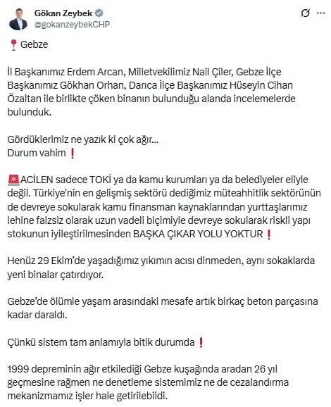 CHP'li Gökan Zeybek sosyal medya hesabından yaptığı açıklamada şu ifadeleri kullandı: